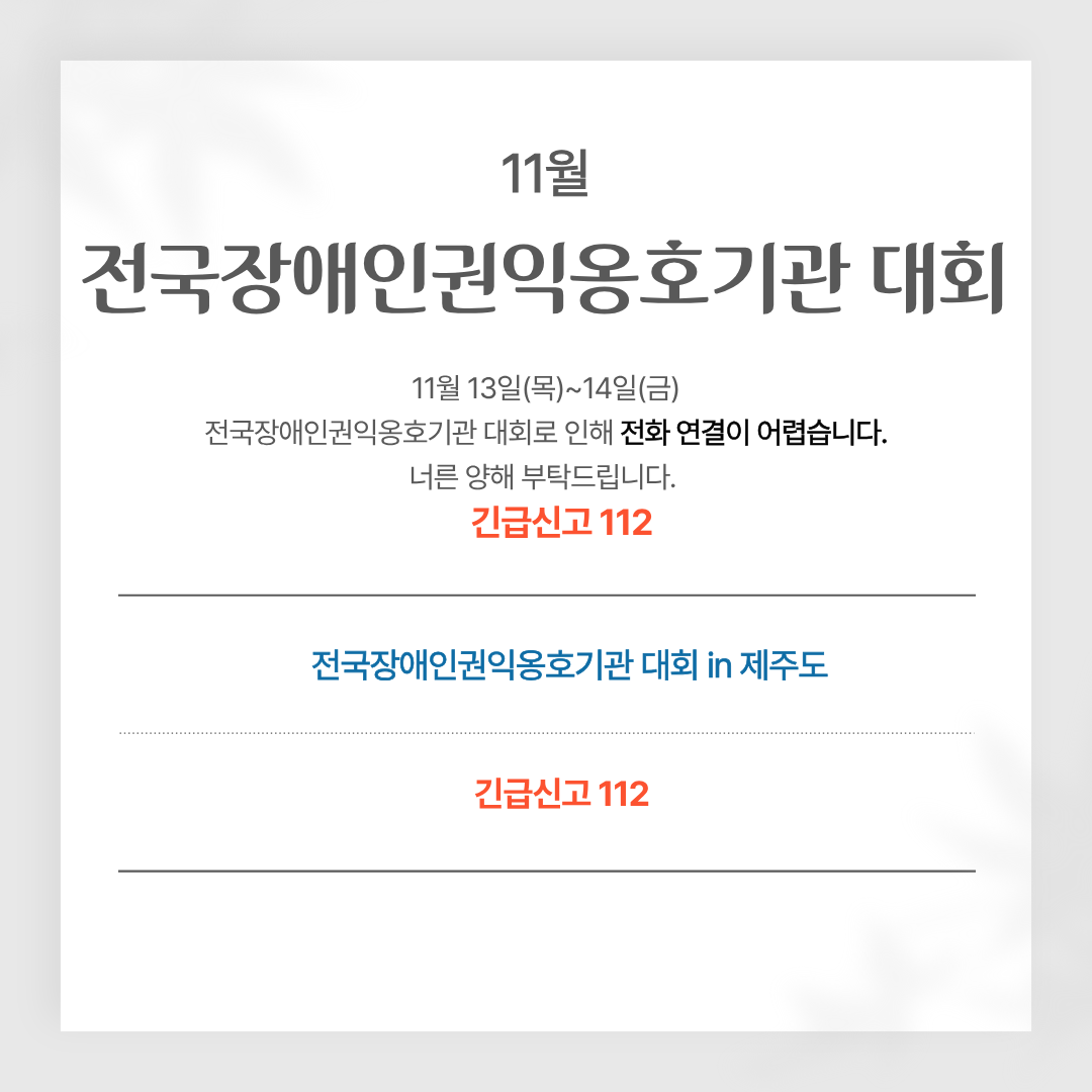 11¿ù 13(¸ñ)~14(±Ý) Àü±¹Àå¾ÖÀαÇÀÍ¿ËÈ£±â°ü ´ëȸ·Î ÀÎÇØ ÀüÈ ¿¬°áÀÌ ¾î·Æ½À´Ï´Ù.